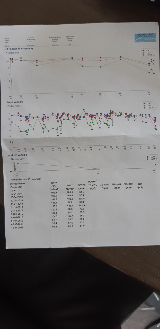 Nu was alleen die vervelende hoest dag en nacht aanwezig. Dus we hadden wel verwacht dat de longfunctie minder zou zijn dan normaal. Maar dit keer zijn we best wel geschrokken, hij blies 76,7 % waar hij normaal boven de 100% blaast. Dit was best wel even schrikken, hoe kan dit?? Die dag is er ook weer bloed geprikt op de allergische reactie op de schimmel Aspergilles. Een paar dagen later hoorden we dat dit 1 van de grote boosdoensers is, de waarde was van rond de 200, naar boven de 1000 gestegen. Dus hop hop... Ben weer aan de prednison met een niet al te kinderachtige dosering, namelijk 40 mg per dag.