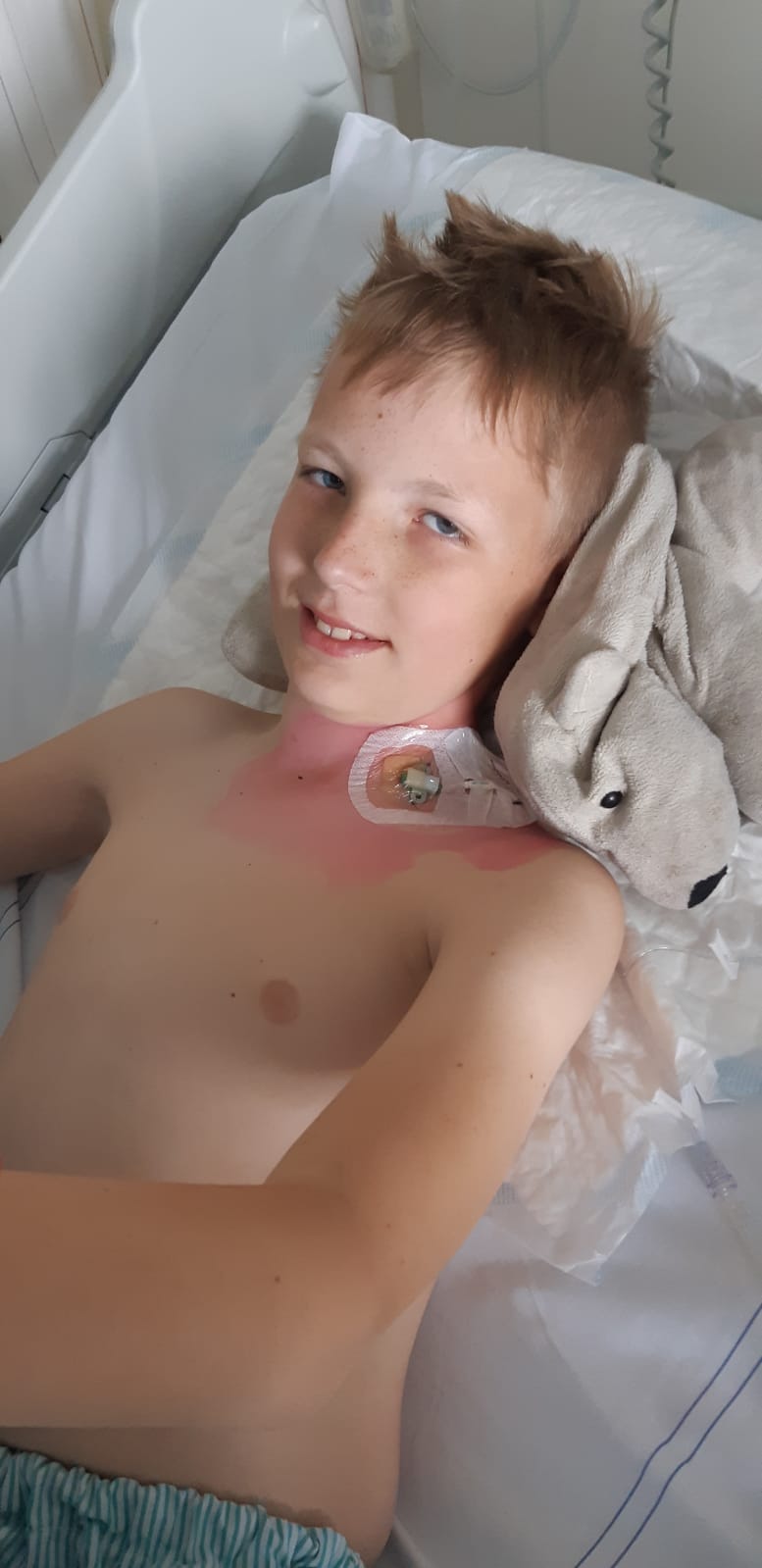 Om 7 uur moesten Ben en mama zich melden in het Sophia kinderziekenhuis en konden Boaz en papa zich nog een keer omdraaien. Dus Wiebes Taxibedrijf stond om 6.30 voor de deur om ons veilig af te leveren op onze bestemming. Ben was als eerste aan de beurt, dus gelukkig hoefde we niet lang te wachten en hoefde Ben een keer niet heel lang nuchter te zijn. Want de zenuwen spelen echt wel op, maar Ben deed het super goed, en viel rustig in slaap. Drie uur later mocht mama weer naar Ben toe op de uitslaapkamer. Bij de deur hoorde ik al een boos en verdrietig jongetje roepen om zijn moeder. Ben lag veel te hoesten, maar had vooral erg veel last van de lijn. Helaas lukte het echt niet om een picclijn in zijn armen te krijgen. Beide armen hadden ze geprobeerd, maar waren niet gelukt. Daarom heeft hij nu een centrale lijn in zijn halsader. Een vervelende plek en voor Ben erg gevoelig. Ben bleef maar schreeuwen dat hij pijn had en dat ding eruit wilde hebben, want hij ging naar huis. Hij was er helemaal klaar mee. Hij kreeg daarvoor extra pijnstilling, wat iets hielp. Maar bewegen durfde hij niet zo goed. Stap voor stap lukte het hem om steeds wat meer te bewegen. De longen waren twee keer gespoeld en er is flink wat troep (lees vies sputum) uit zijn longen gekomen. Er is medicatie in de longen achtergelaten tegen de schimmel en om het slijm losser te maken en zo dus makkelijker op te hoesten. De fysio kwam ‘s middags ook langs om hem hierbij te helpen. Maar de lijn zat te vervelend om goed door te kunnen hoesten.